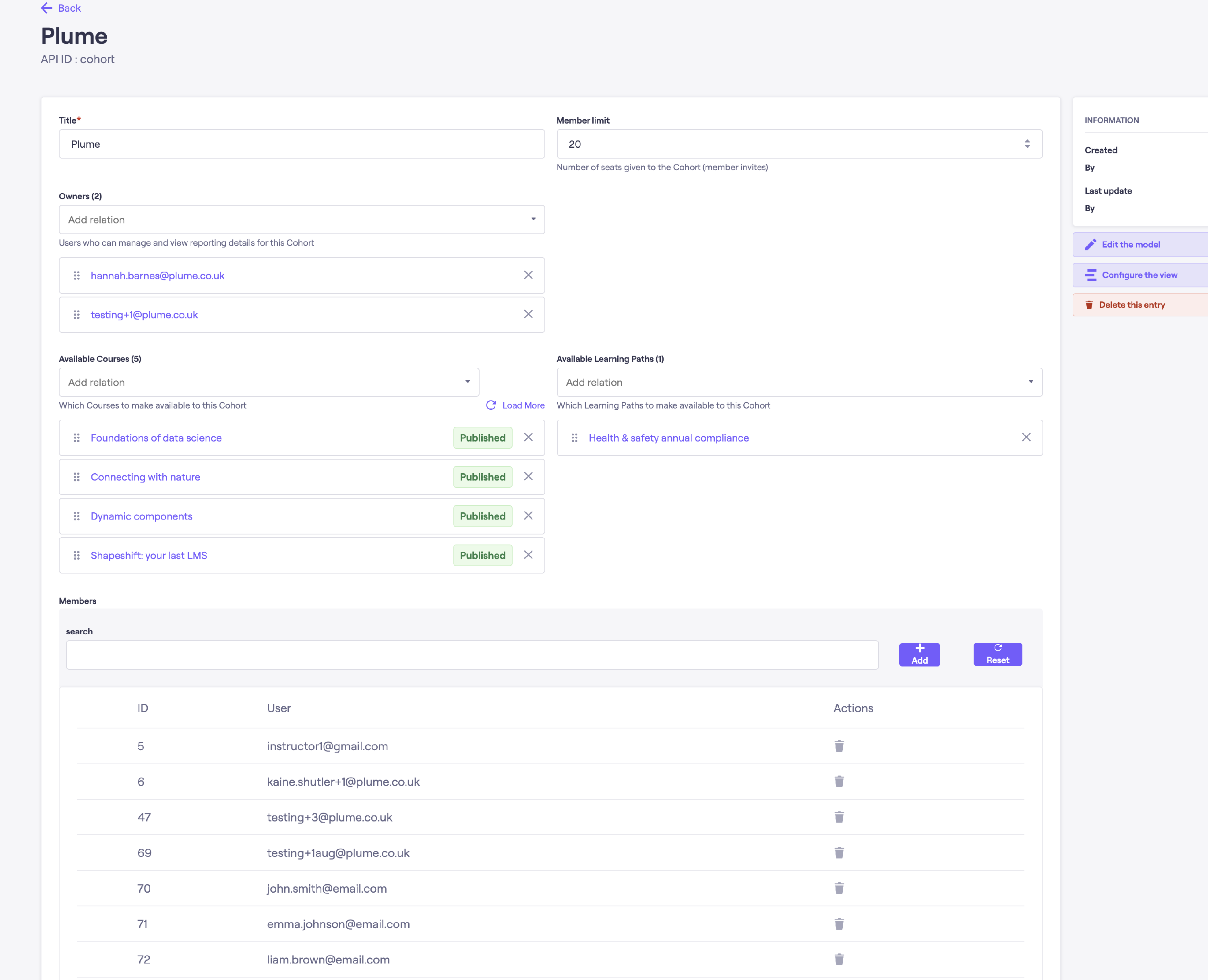 | Members | Learners who belong to the cohort. Members are usually added by owners via invitations from the front end, but admins can also manage them here. |