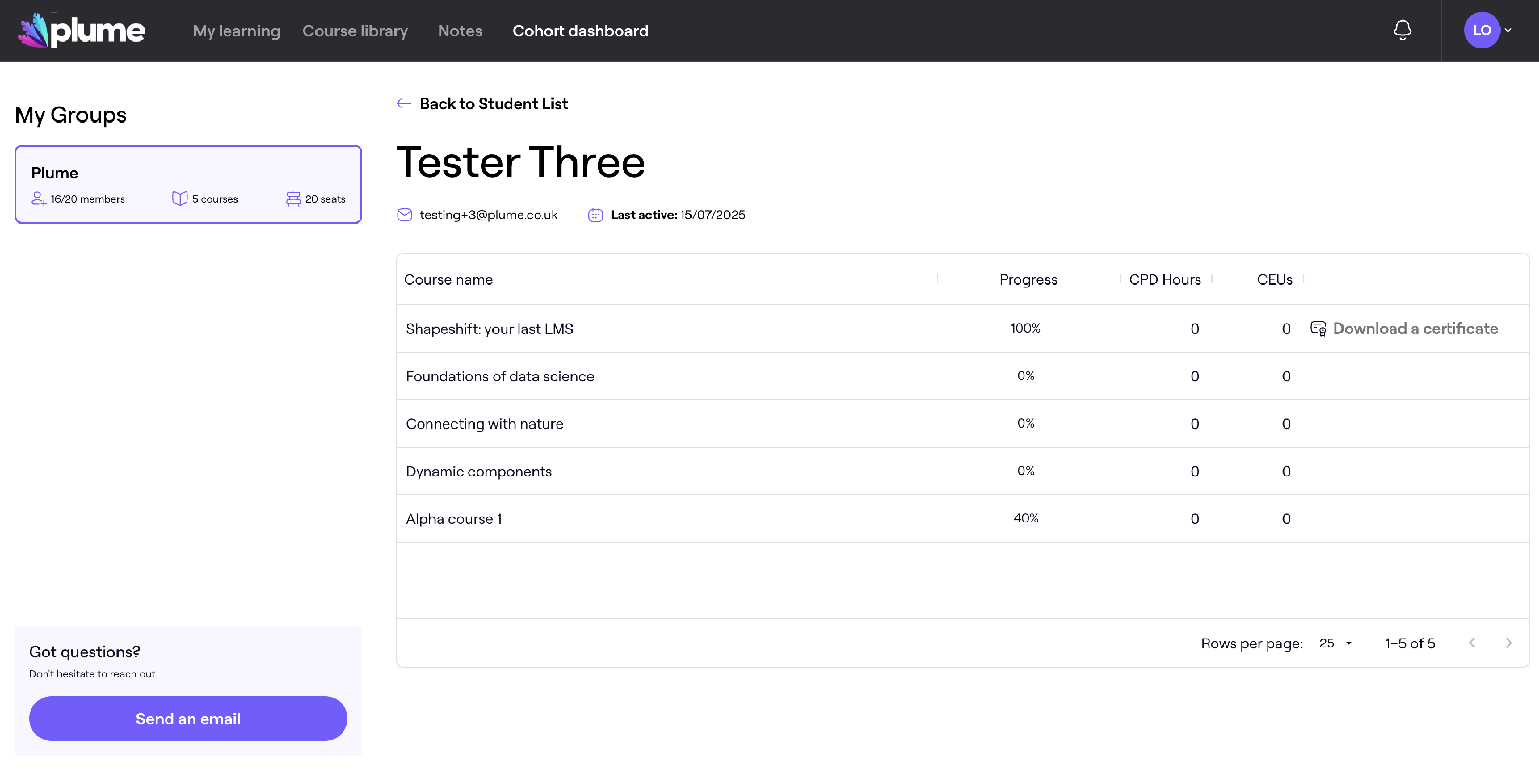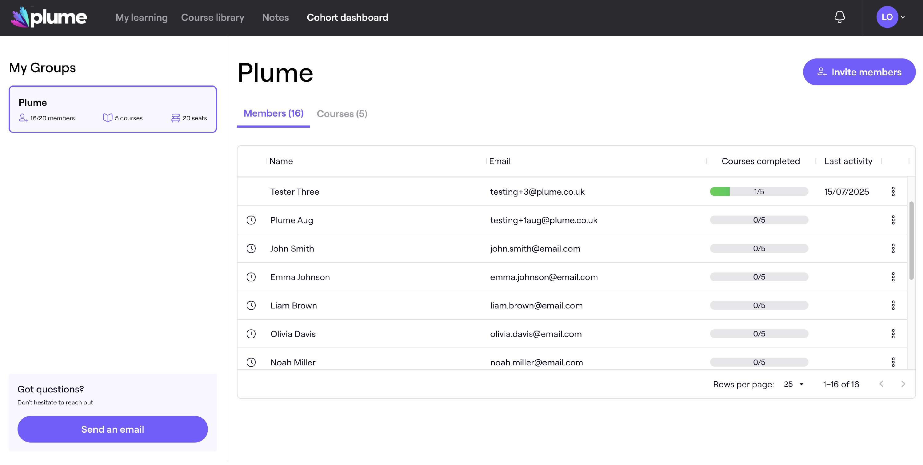 Cohort Owners can view progress and activity for each learner directly within the Members tab.